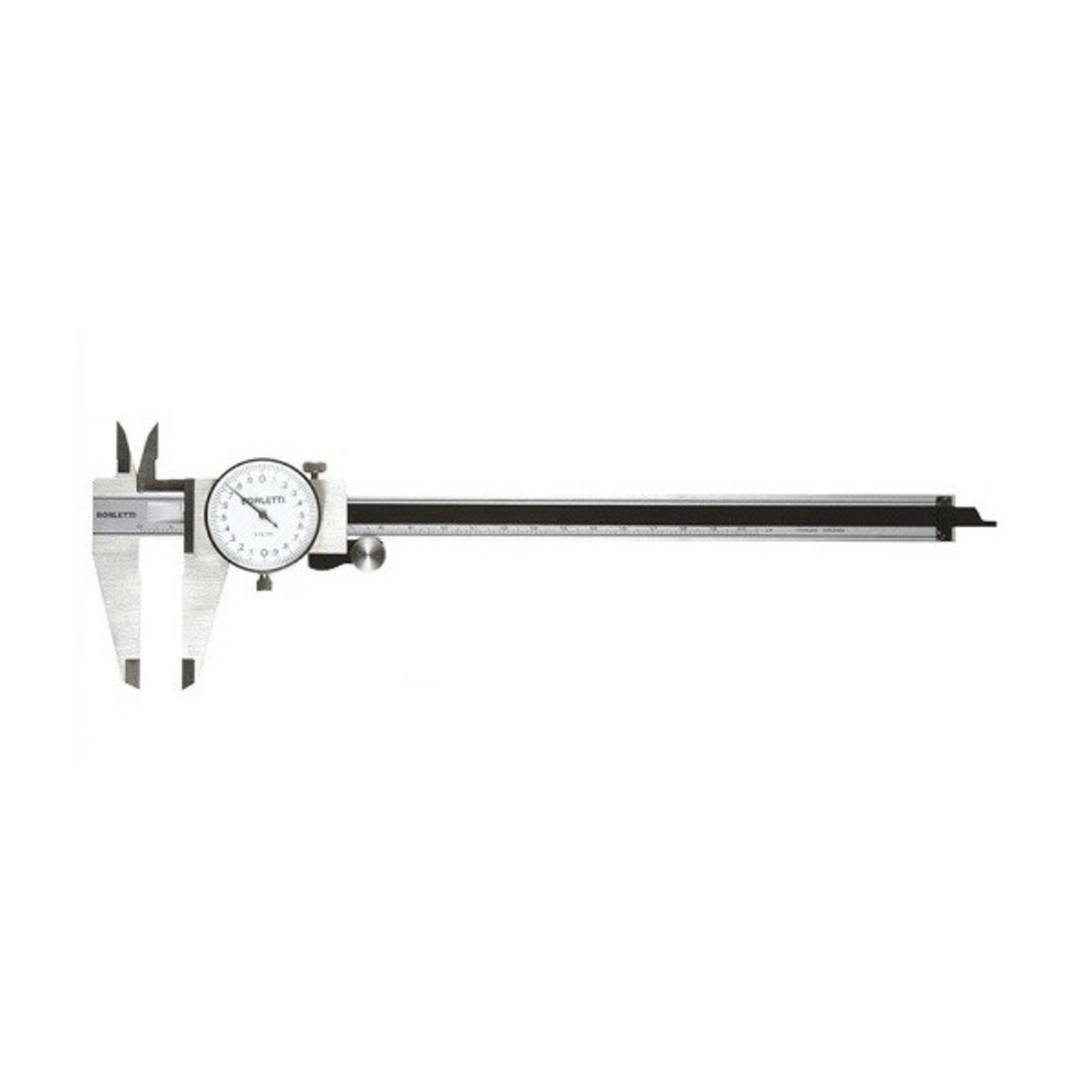I calibri con orologio «BORLETTI» hanno elevate caratteristiche di precisione, durata e robustezza. La presenza del dispositivo di lettura con comparatore, garantisce un´estrema facilità ed immediatezza di lettura. Becco di misurazione e regolo costruiti in un solo pezzo. Esecuzione in acciaio inossidabile interamente temprato.