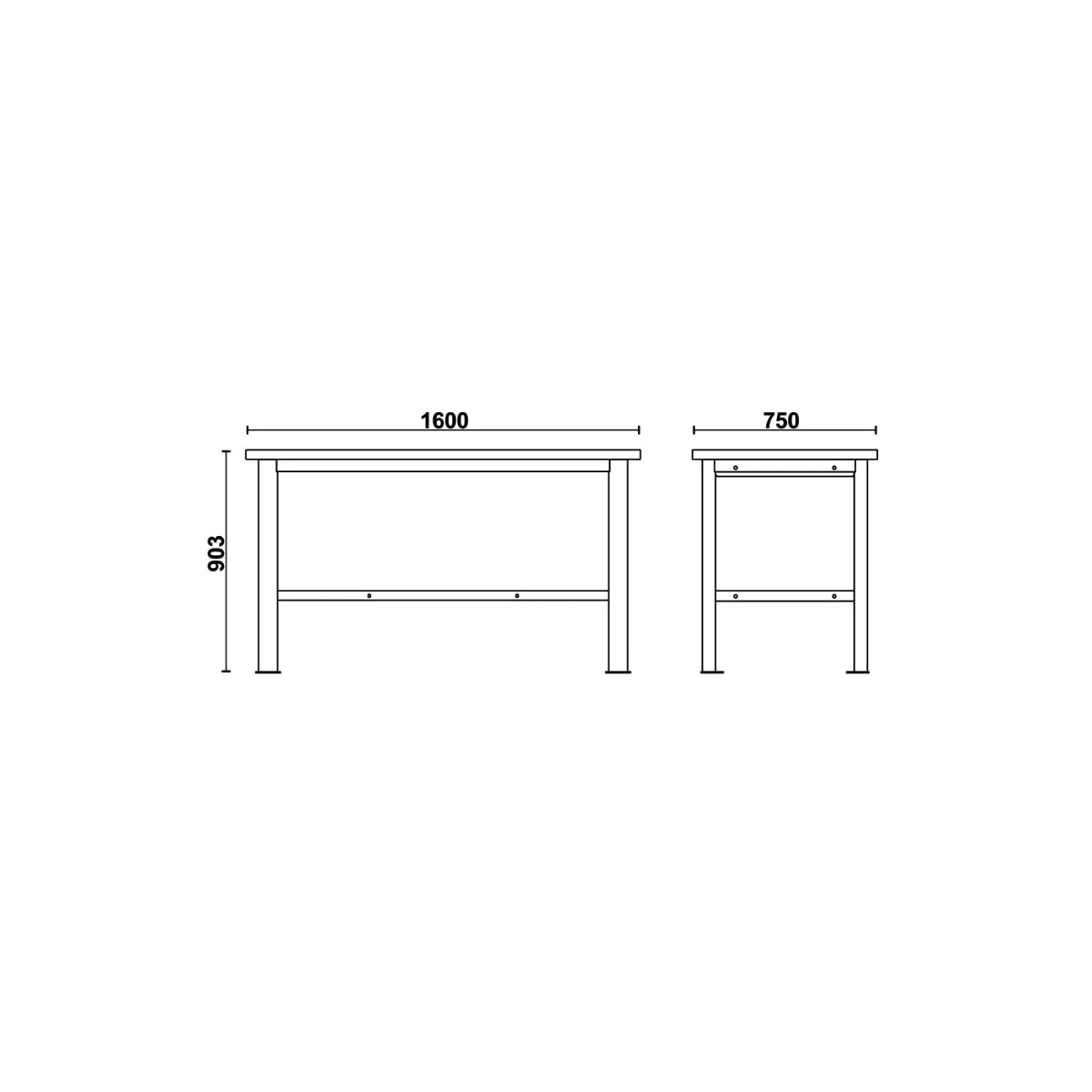 • Piano di lavoro in legno multistrato 1.600x750 mm, spessore 38 mm