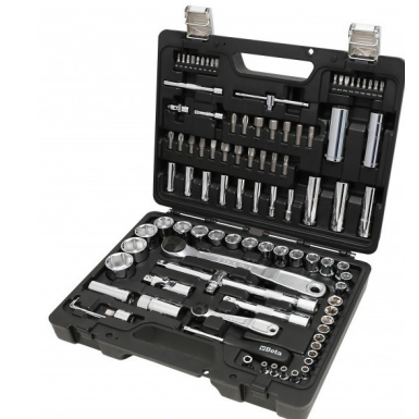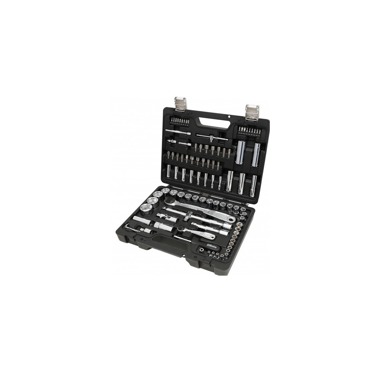 Valigetta con cricchetti e chiavi a bussola Beta, in acciaio basso legato al cromo - vanadio, composta da 98 pezzi il tutto racchiuso in una pratica valigia in plastica con l'organizzazione degli inserti.