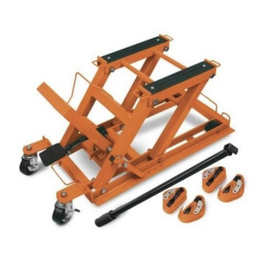 Durante la riparazione, la sicurezza vostra e della moto e garantita da un elevata stabilità e da una capacità di portata che raggiunge i 680 Kg. Comprese con la piattaforma sono presenti cinghie di sicurezza con le quali è possibile fissare la moto.