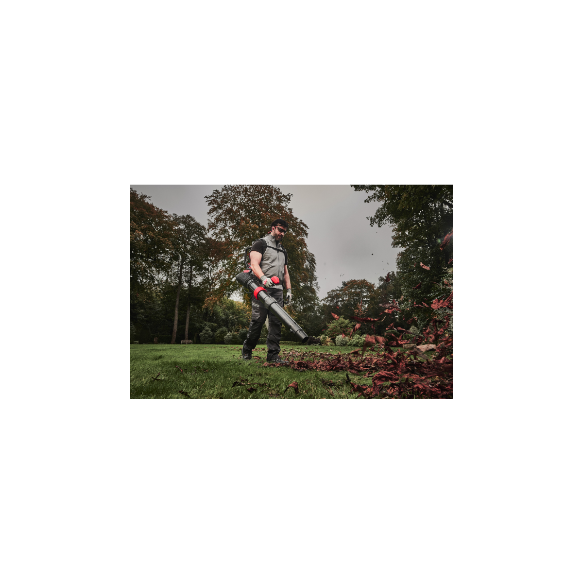 -Soffiatore spalleggiato che opera con 2 batterie 18V in serie (2x18V = 36V), con schienale imbottito e cinghie regolabili imbottite per massimo comfort