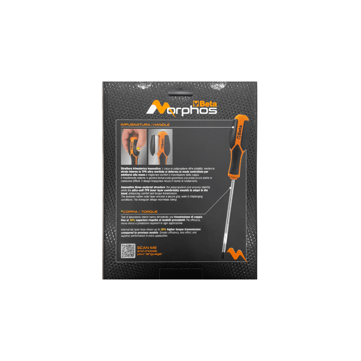 Il giravite Morphos offre una presa eccellente anche nelle condizioni più difficili, grazie al materiale resistente a grasso, olio, idrocarburi e sporco, e alla sezione triangolare che ne impedisce il rotolamento sul piano di lavoro.