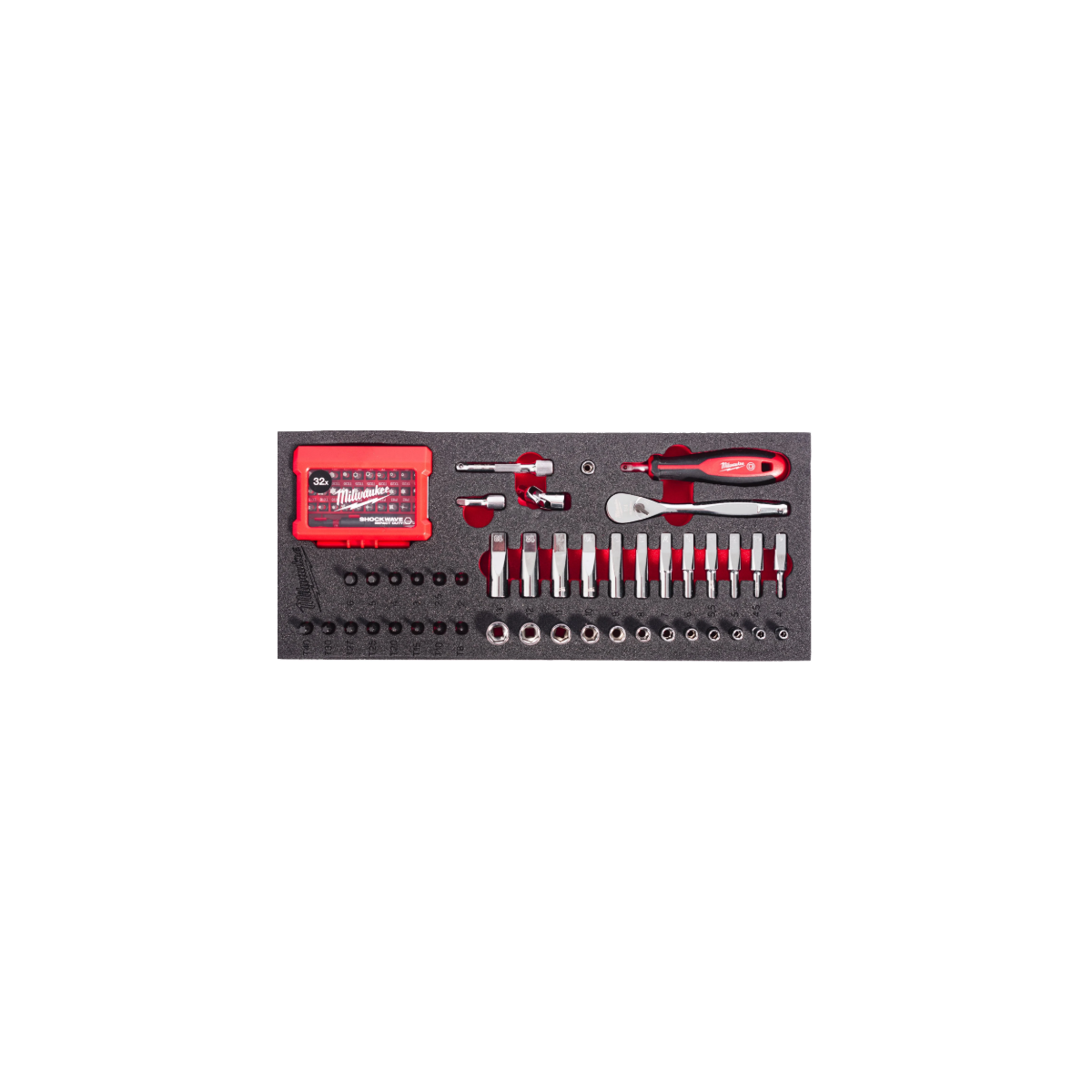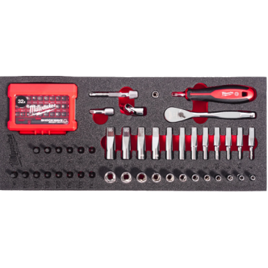 -Cricchetto da ¼″, bussole corte: 4mm, 4.5mm, 5mm, 5.5mm, 6mm, 7mm, 8mm, 9mm, 10mm, 11mm, 12mm, 13mm / Bussole lunghe: 4mm, 4.5mm, 5mm, 5.5mm, 6mm, 7mm, 8mm, 9mm, 10mm, 11mm, 12mm, 13mm / Chiavi a bussola - Torx: T8, T10, T15, T20, T25, T27, T30, T40 / Chiavi a bussola - esagonali: 2mm, 2.5mm, 3mm, 4mm, 5mm, 6mm / Bussola portainserti / Snodo cardanico / Quadro maschio con impugnatura / Prolunghe: 38, 76mm / Set 32 pezzi bit SHOCKWAVE™