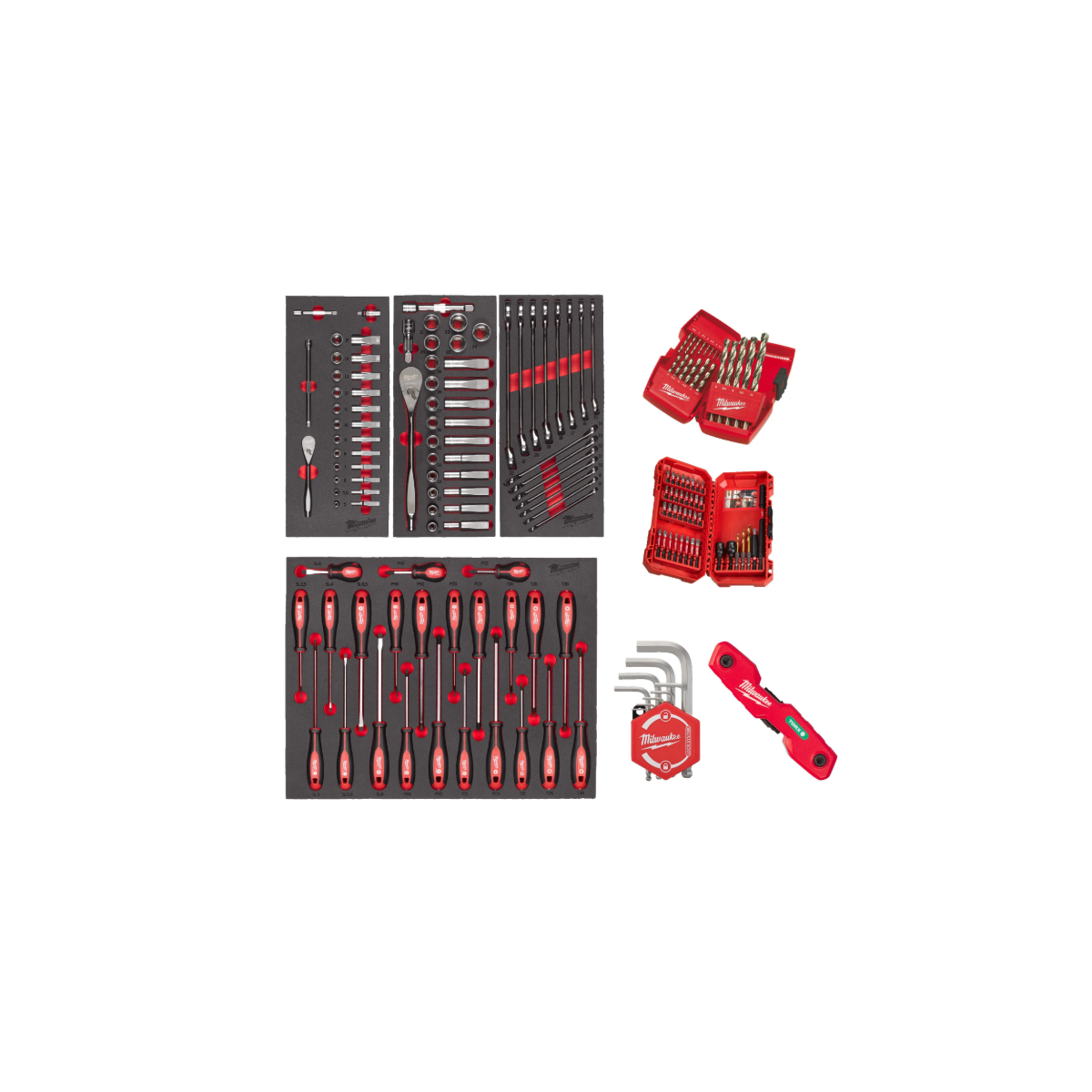 -Contenuti: Set cricchetto e bussole da 1/4˝ - 28 pezzi (4932479824), Set cricchetto e bussole da 1/2˝ - 28 pezzi (4932479826), Set chiavi combinate MAX BITE™ (4932479827), Set giraviti completo - 23 pezzi (4932479830), Set chiavi Torx pieghevoli - 8 pezzi (4932480979), Set chiavi esagonali compatte (4932492399), Set 40 pezzi AVV./FORAT. SHOCKWAVE™ (4932492004), Set punte HSS-G 19 pz. (Ø da 1 a 10 con incrementi di 0.5) (4932352374)