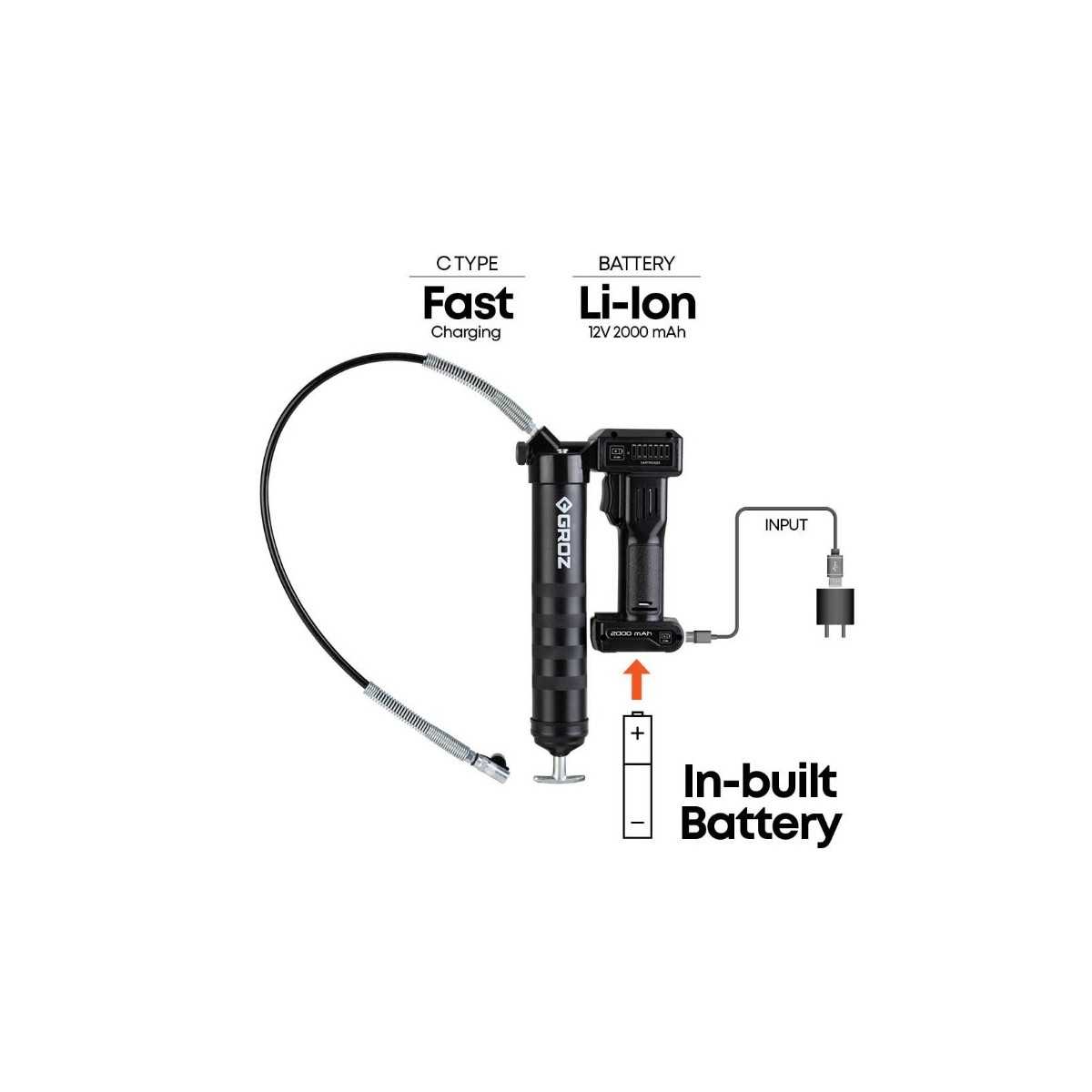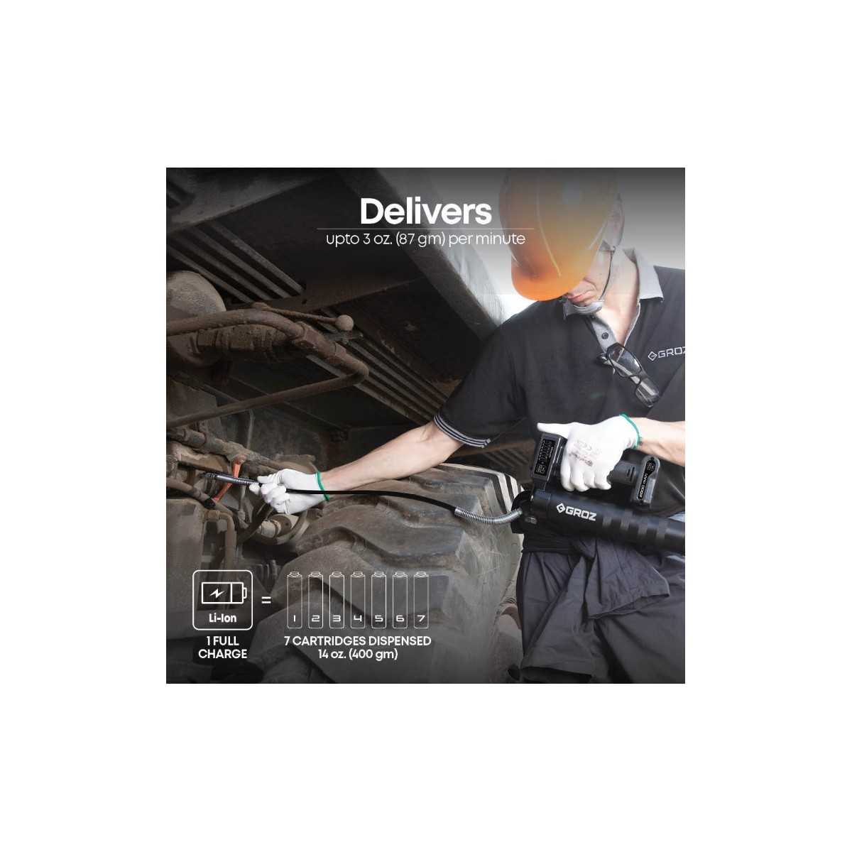 La pistola per grasso ricaricabile Groz da 12 V è la prima pistola per grasso a batteria al mondo con batteria integrata, una vera rivoluzione nel campo della lubrificazione. La sua capacità di pompaggio senza pari, tre volte superiore a quella delle pistole per grasso manuali, la rende la scelta ideale per officine, garage e altre applicazioni che richiedono una lubrificazione precisa. La pistola per grasso è dotata di una robusta testa in alluminio pressofuso con valvola di rilascio dell'aria, tubo flessibile ad alta pressione da 750 mm (30"), attacco idraulico a 3 griffe e un corpo verniciato a polvere di alta qualità che garantisce durata per un uso prolungato. Alimentata da una batteria agli ioni di litio da 2000 mAh, leggera e compatta, questa innovativa pistola per grasso può svuotare fino a 7 cartucce da 400 g (14 oz) con una singola carica completa, migliorando la produttività e riducendo i tempi di fermo.