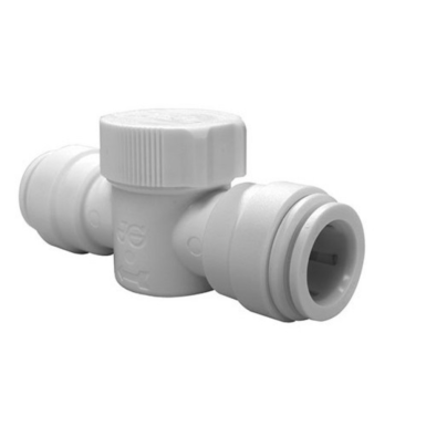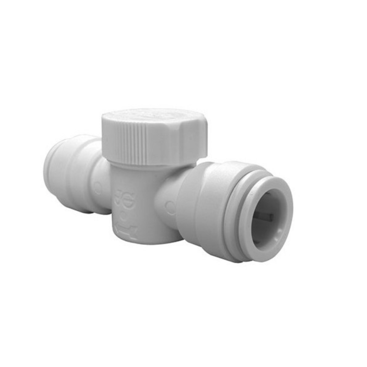 Valvola a sfera di intercettazione originale John Guest per acqua potabile realizzata con attacchi rapidi per tubo da 15 mm. Le valvole sono composte da un meccanismo a sfera azionabile con un cacciavite.
